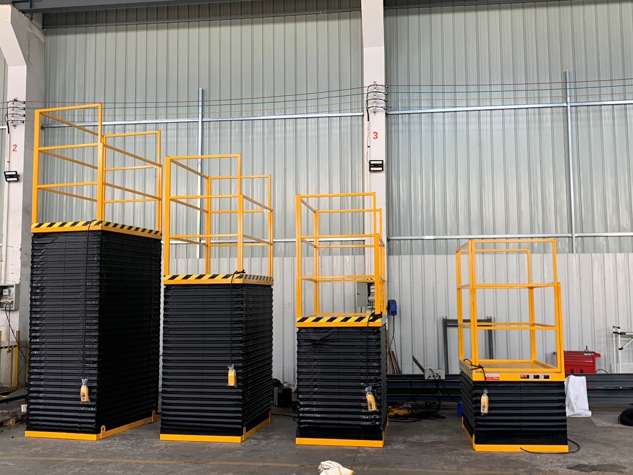 订制四台升降平台 交货,载重500KG,按照客户要求添加防尘罩。升降速度在35/s, 液压系统加配防爆装置,护栏高度设计到1.5m, 最大程度保证使用时的安全性的同时防止了粉尘进入液压系统,更好的维护动力系统,确保工作效率并且延长机器的使用寿命。客户对产品质量非常满意。